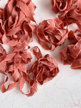 Item #218 is a Silk Classic Ribbon Trim in a deep salmon pink color. It's made with 100% Silk Crepe, has a lightweight feel with a matte texture. This is a one-of-a-kind, single batch color, and will not be available for purchase after selling out. This item ships in as-is condition, without our signature packaging, making it possible for us to pass along a deeper discount to you.