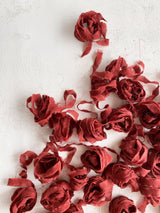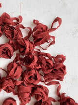 Item #221 is a Silk Ribbon Trim in a deep red color. It's made with 100% Silk, has a lightweight feel with a matte texture. This is a one-of-a-kind, single batch color, and will not be available for purchase after selling out. This item ships in as-is condition, without our signature packaging, making it possible for us to pass along a deeper discount to you.